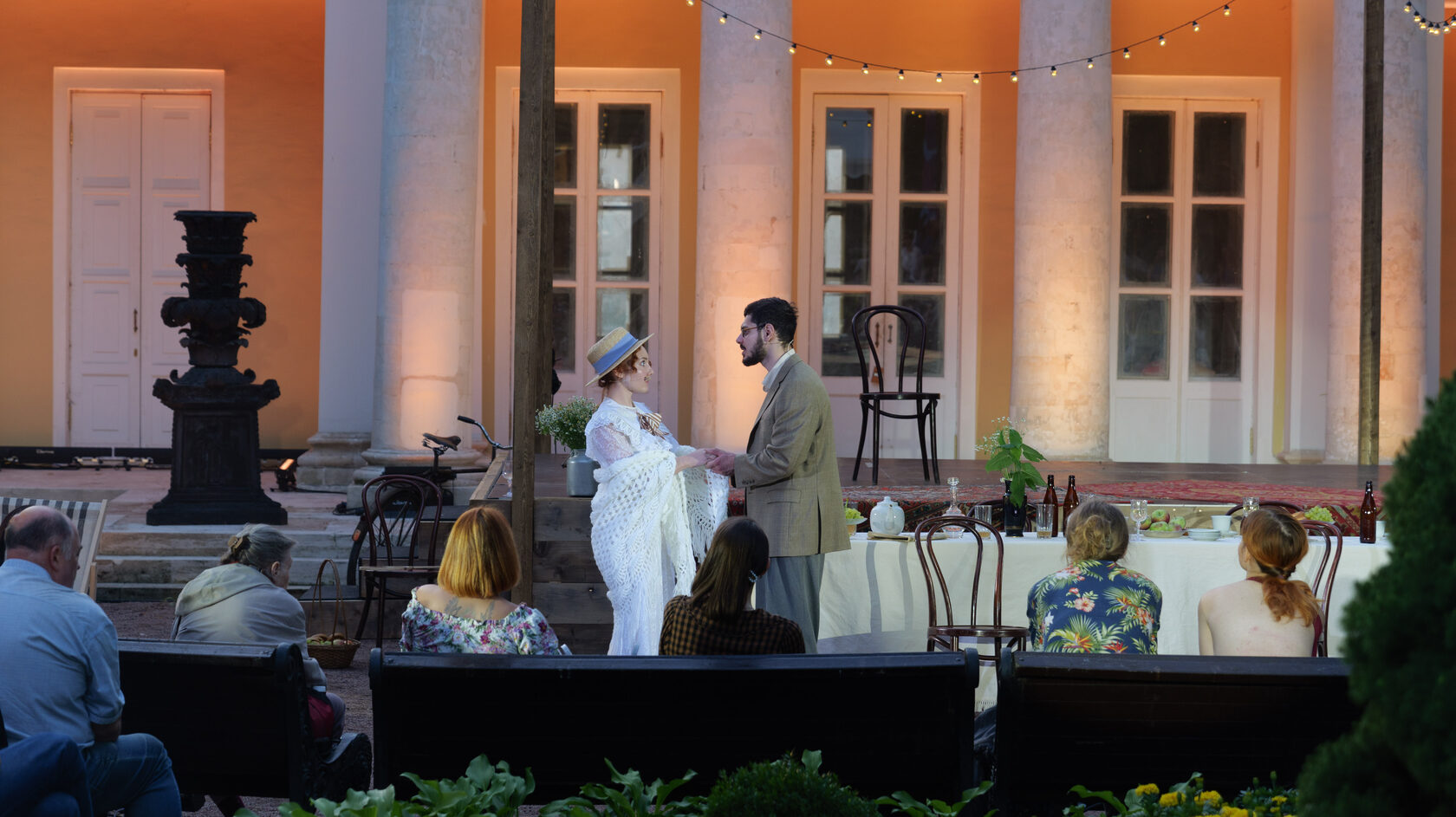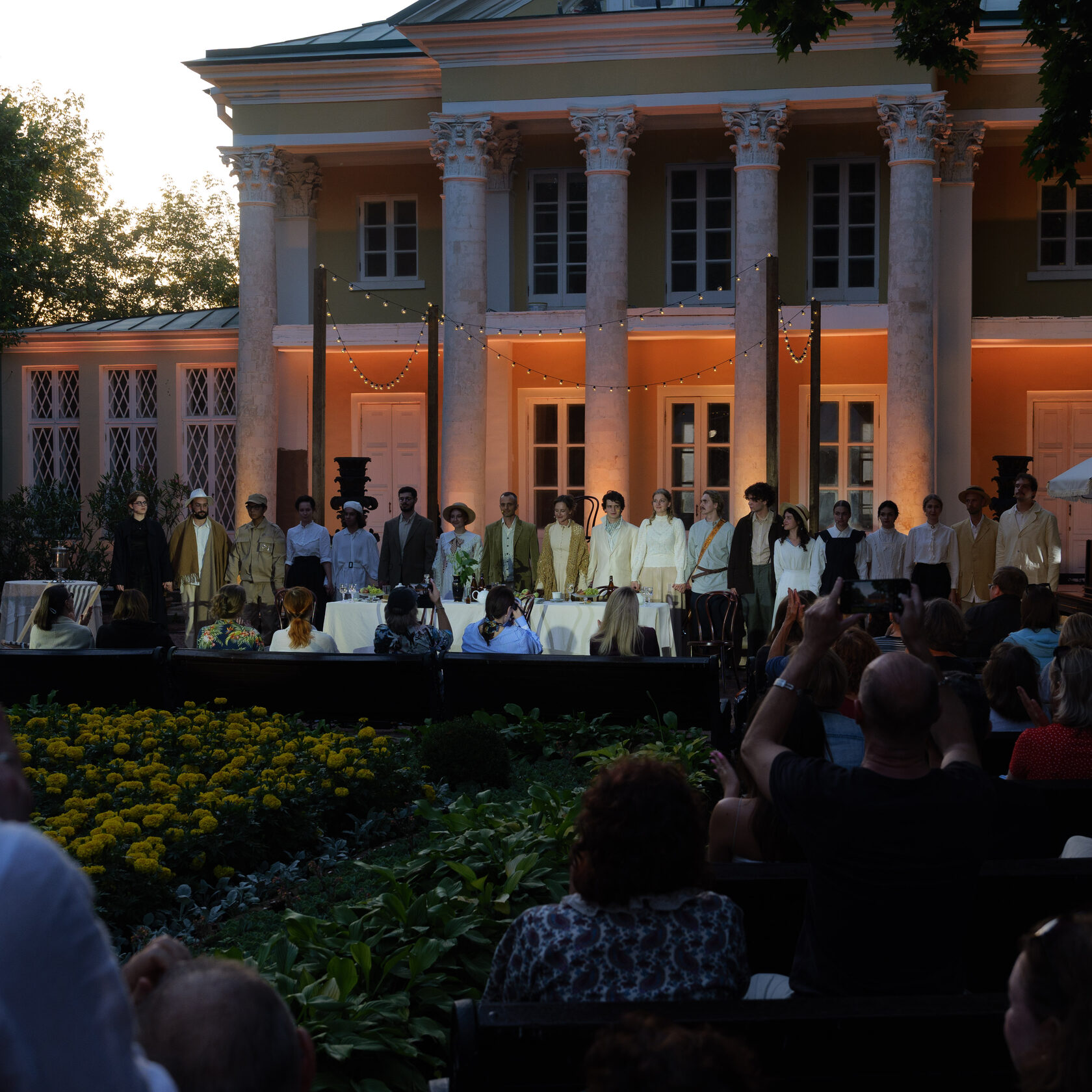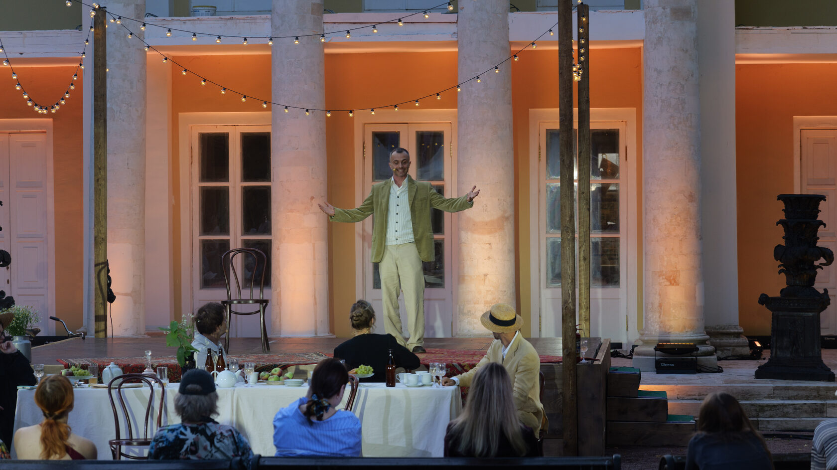 Спектакль «Дачники» стал уникальным событием: зрители провели целых пять часов на даче вместе с героями пьесы, погрузившись в особую атмосферу. За это время, наполненное событиями и напряженными спорами персонажей, ясное летнее солнце успело смениться закатным небом, что создавало невероятный визуальный и эмоциональный эффект.